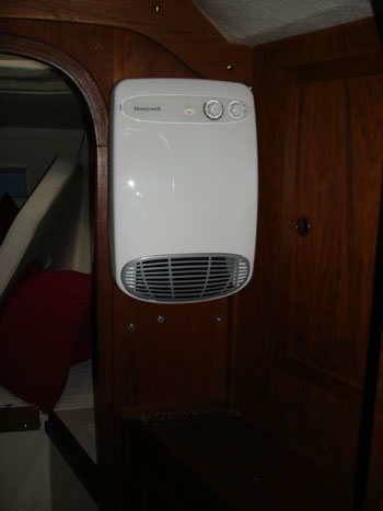 Wie bereits angekündigt, habe ich eine neue Heizung eingebaut. Die Leistung ist von 500 bis 2000 Watt wählbar und die gewünschte Temperatur durch ein eingebautes Thermostat frei einstellbar. Somit braucht kein Heizlüfter mehr im Boot herumstehen. Ein Bild davon gibt es hier: