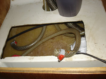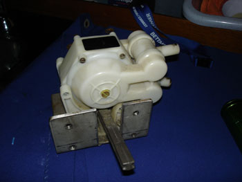 Da eine defekte “Tretpumpe” für das Salzwasser die Bilge im vergangenen Jahr langsam und unbemerkt vollgetropft hat, habe ich nun die Pumpe für das Süsswasser zur Sicherheit auch ausgebaut, um sie auszutauschen. Bei der Salzwasserpumpe war nach knapp 30 Jahren ein Membran undicht geworden!